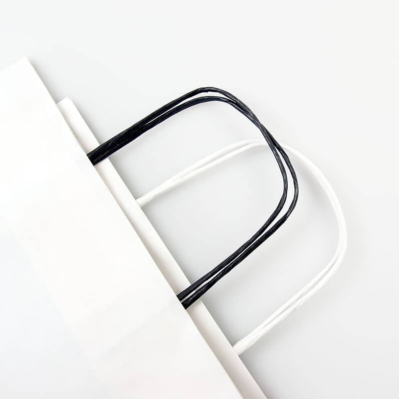 Les poignées torsadées sont disponibles en blanc ou en noir et permettent un port du sac à la main. Le papier tourné produit un effet et accentue la solidité du matériau. Les poignées sont fixés au sac par une machine.