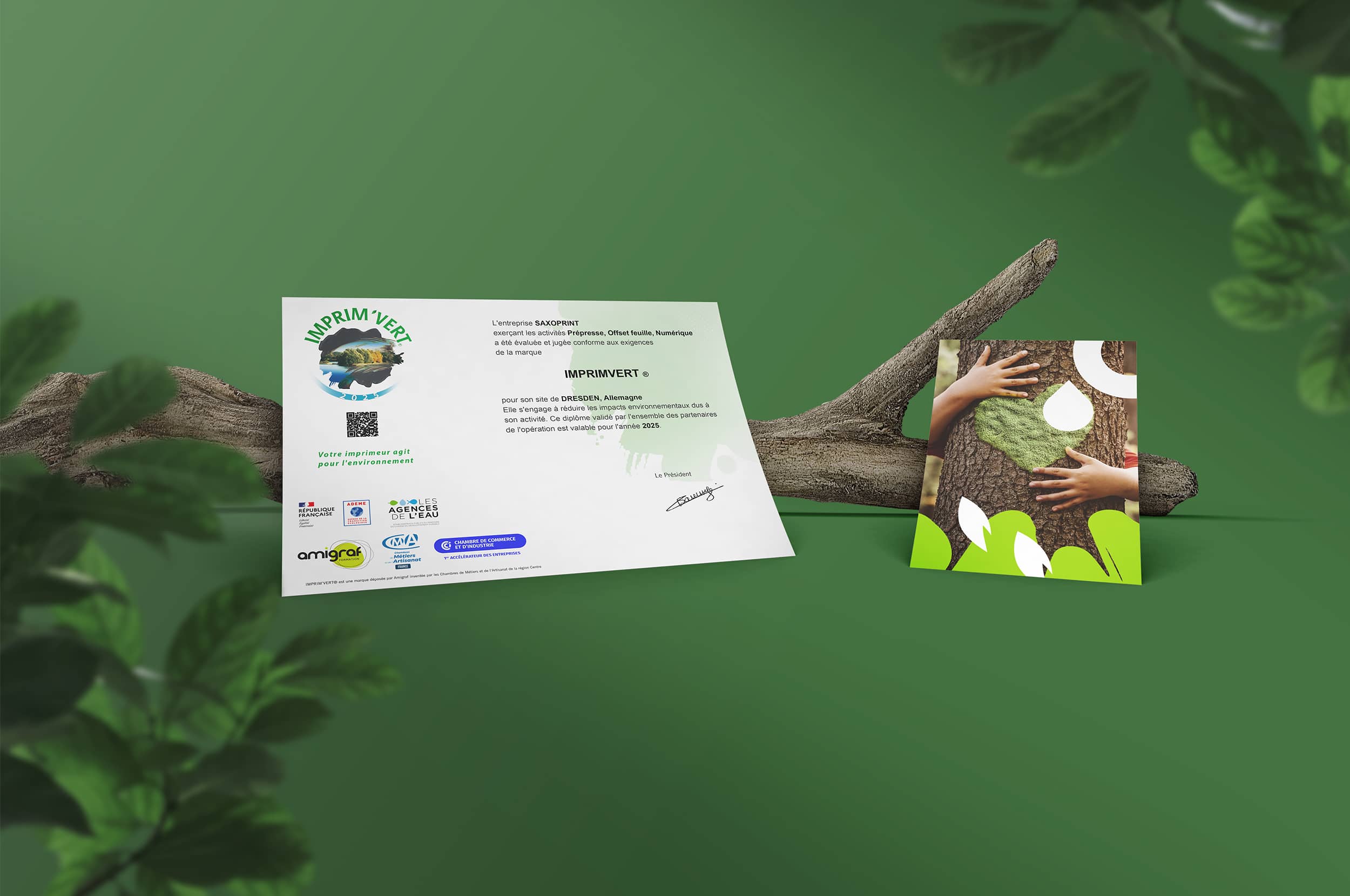 Imprim'Vert est un certificat environnemental français spécialement conçu pour les imprimeries. SAXOPRINT a obtenu le certificat Imprim'Vert en 2017, après un examen approfondi de tous les processus de notre entreprise ayant un impact sur l'environnement, et l'a régulièrement mis à jour. Sont notamment examinés les matériaux utilisés, leur stockage, leur utilisation et leur élimination, la suppression maximum des substances toxiques ainsi qu'une gestion durable de l'énergie.